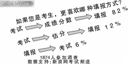 央视时空调查栏目针对目前我国现行的高考填报志愿的三种形式作了一个网上调查,调查的结果如下,你作为一名即将参加2008年高考的一名考生,请简要的描述调查的结果,并谈一谈你对此事的看法并说明你的理由。
