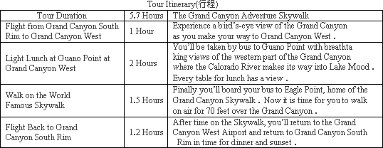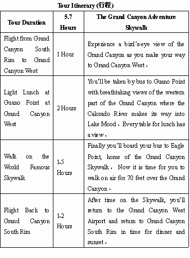 Experience the newly opened Grand Canyon (大峡谷) West Skywalk in Colorado. Departing from Grand Canyon's South Rim by Airplane to Grand Canyon's West Rim, you will land and take a ground tour to the Skywalk! Walk on air for 70 feet over the edge of Grand Canyon West. This Skywalk has been open since March 28, 2007. Daily visitorship to the Skywalk has been over 4,000 people. Please be patient to enjoy your moment on the Skywalk. After you have experienced the one and only Grand Canyon Skywalk Glass Bridge, you will return to the Grand Canyon West Airport and take your Airplane for a flight back to the South Rim of the Canyon. This is a tour never to be forgotten as you will have walked on air over the Grand Canyon. Tour Itinerary (行程)