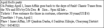 Tickets: 40 yuan (US$4.80) in advance, 50 yuan (US$6) at the door, both include a free drink