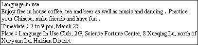 Place: Language In Use Club, 2/F, Science Fortune Center, 8 Xueqing Lu, north of Xueyuan Lu, Haidian District
