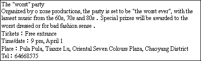 Organized by o?zone productions, the party is set to be "the worst ever", with the lamest music from the 60s, 70s and 80s. Special prizes will be awarded to the worst dressed or for bad fashion sense.