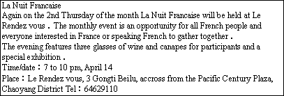 Place: Le Rendez?vous, 3 Gongti Beilu, accross from the Pacific Century Plaza, Chaoyang District Tel: 6462?9110