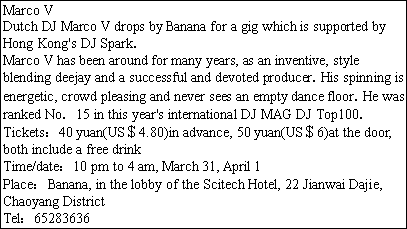 Dutch DJ Marco V drops by Banana for a gig which is supported by Hong Kong’s DJ Spark.
