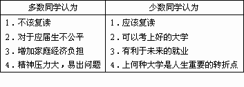 近几年,“考生该不该复读”这一话题一直为社会各界所关注。下表是某班同学的讨论结果,请你就此给某英文报社写一封信客观地介绍讨论情况并简要阐述自己的观点。