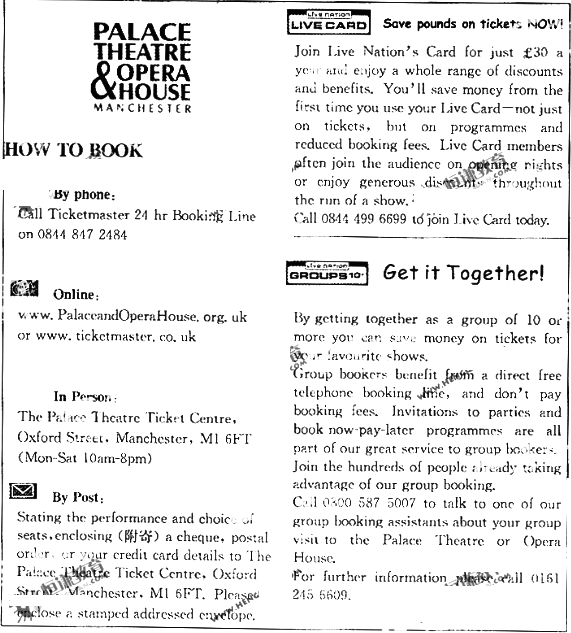 Stating the performance and choice of seats ,enclosing(附寄)a cheque , postal order ,or your credit card details to The Palace Theatre Ticket Centre , Oxford Street , Manchester , Ml 6FT . Please enclose a stamped addressed envelope. |