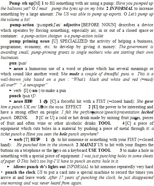 Verb(t) hit 1 to hit someone or something with your FIST (=closed hand);He punched him in the stomach.2 MALY US to hit with your fingers the bugins on a telephone or the kdys on a keys on a keyboard USE TOCL make a hole in something with a special piece of equipment:I was just punching holes in some sheets of paper .This belt’s too big .I’ll have to punch an extra hole in it.