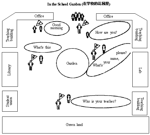 ①School gate学校大门 ②Teaching building教学大楼 ③Garden花园 ④Library图书馆 ⑤Lab实验室 ⑥Green land绿地 ⑦Student union学生会 ⑧Office办公室 ⑨Where are they talking?他们在哪儿谈话?