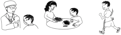 根据图示和所学过的知识,为每幅图写两个句子. 提示:often ill, begin to eat all kinds of food, exercise, healthy, take part in(参加)