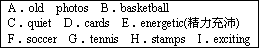 1.Lily likes collecting ________, ________ and ________, but Tom likes sports, such as, ________ ________ and ________.