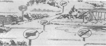 假如你正在为一些中国学生做导游,参观、游览英国伦敦的一个公园。请你根据下面公园的示意图,为他们说明a、b、c、d四项公园规则。(请写关键信息,句式不限。)