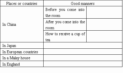 If you visit a Chinese family you should knock at the door first. When the door opens, you will not move before the host says “Come in, please.” After you come into the room, you won't sit down until the host asks you to. When a cup of tea is put on a tea table before you or sent to your hand, you will say “Thank you” and receive it with your two hands, or they will think you are not polite.