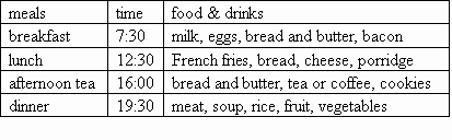 Albert今年5月去英国留学,他住在Smith夫妇家,和他们一起生活。英国的饮食和中国有所差别,以下是他的一篇日记,记述了他一天的生活,根据表格所提供的信息,完成他的日记。