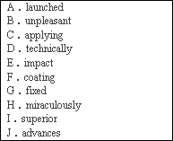 The creation of self-cleaning clothes provides an example of how nature helps scientists develop better products.This self-cleaning nature is known as the “lotus effect”.The name comes, of course, from the lotus leaves, which are famous for growing in muddy lakes and rivers while remaining almost 3 clean.By observing nature, scientists are 4 the qualities of the lotus leaves to the materials they have engineered.Because of this, some remarkable new products have been 5 .Among them are special windows that are resistant to dirt and water.A special 6 on these windows not only prevents dirt from sticking to their surfaces, but also allows dust to be easily washed off by the rain.In fact, these new windows have already been 7 to some cars.Even when traveling at high speed through rain, these cars never have to use their windshield wipers(雨刮器).