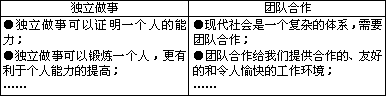 | 写作。 有些人喜欢独立做事,有些人更喜欢团队合作。你班最近在口语课上就独立做事 和团队合作哪个更重要进行了讨论,请你根据下表中讨论的内容,写一篇120词左右 的英语短文,并谈谈自己的看法。