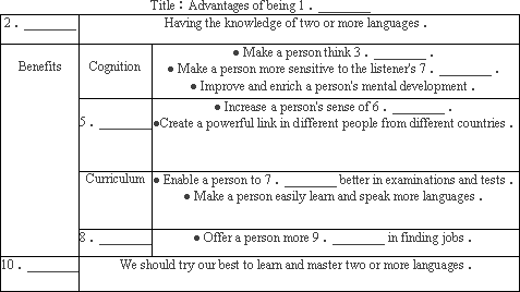 A person can get cognitive (认知的) benefits from it.The bilingual people have two or more words for each idea and object.Therefore,a bilingual person can develop a creative thinking.The bilinguals know which language should be spoken with which person in a particular situation.So they are more sensitive (敏感的) to the needs of the listener than the people who only use one language:Being bilingual also improves and enriches a person’s mental development.