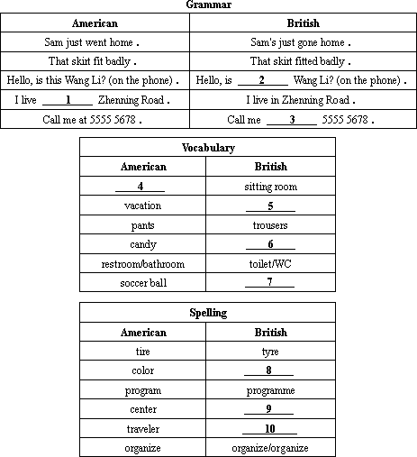 摘要:American vs British English American and British English differ in many small ways. All English speakers understand each other, but it is helpful to know about some of the differences. Grammar American British Sam just went home. Sam’s just gone home . That skirt fit badly. That skirt fitted badly. Hello, is this Wang Li?. Hello, is 54 Wang Li?. I live 55 Zhenning Road. I live in Zhenning Road. Call me at 5555 5678. Call me 56 5555 5678. Vocabulary American British 57 sitting room vacation 58 pants trousers candy 59 restroom/bathroom toilet/WC soccer ball 60 Spelling American British tire tyre color 61 program programme center 62 traveler 63 organize organize/organize
