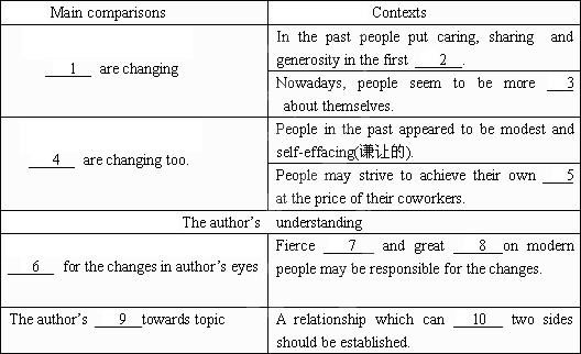 | ___6____ for the changes in author’s eyes | Fierce __7___ and great __8___on modern people may be responsible for the changes. |