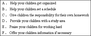 Parents should offer their children a quiet, comfortable place to study in.It's a good idea that studying is done in the same place every day.Parents should make sure their children have the supplies they need(for example, paper, pencils, a pencil sharpener).Sometimes children's bedrooms are not the best place to study in.There are often lots of distractions in children's rooms.