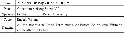 查看习题详情和答案>> 假如你是一名学生干部,学校要举行一次英语讲座,请你以学生会的名义用英语写一个100词左右的通知。通知应包括下列要点: