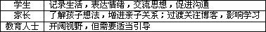 | 家长 | 了解孩子想法,增进亲子关系;过渡关注博客,影响学习 |