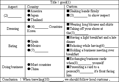 | Conclusion : When traveling(85)________,we should follow local customs. | ||