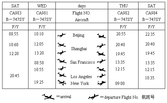 1.A passenger is ready to leave Beijing for New York. What is the flight that he can take? On what day and at what time does it leave?