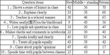 The following table shows some results of a survey (调查) in which 800 Japanese school pupils were asked to give their impressions (印象) of their classroom teachers. The pupils' impressions were found to differ depending on whether the teacher was new (with less than three years' experience), middle-standing (ten to twenty years), or a veteran (有经验的人) (twenty to thirty years). The numbers in the table show the percentage of the pupils who answered “very satisfied” or" extremely satisfied” for each question item (项目).
