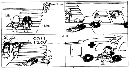 2.中间缺一幅图,请你根据左右两幅图所给的情景和你的想象,把故事发生的原因和结果编写完整。