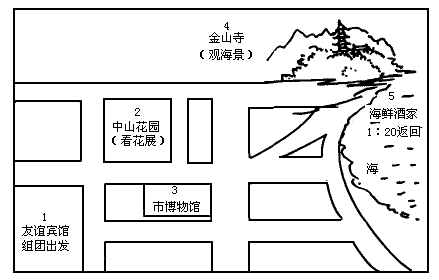 假设5月18日是星期天,你带外国朋友在本市游览,请根据图中游览顺序写一则英文日记.