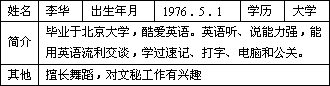 某公司招聘外语人才,假如你是李华,前去应聘,外方代表要求你用英语按表中内容作自我介绍。