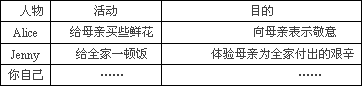 母亲节即将来临,你和好友Alice和Jenny商量怎样庆祝母亲节。根据下面的表格内容写一篇日记,把你们的计划写下来。