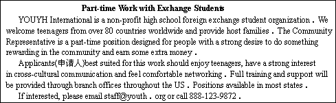 Applicants(申请人) best suited for this work should enjoy teenagers, have a strong interest in cross-cultural communication, and feel comfortable networking. Full training and support will be provided through branch offices throughout the U.S Positions available in most states.
