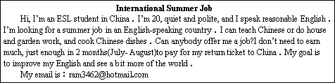 Hi, I’m an ESL student in China. I’m 20, quiet and polite, and I speak reasonable English. I am looking for a summer job in an English-speaking country. I can teach Chinese or do house and garden work, and cook Chinese dishes. Can anybody offer me a Job? I don’t need to earn much, just enough in 2 months (July-August) to pay for my return ticket to China. My goal is to improve my English and see a bit more of the world.