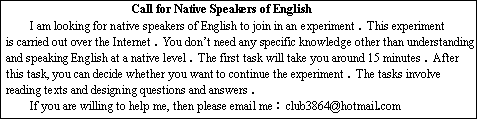 I am looking for native speakers of English to join in an experiment. This experiment is carried out over the Internet. You don’t need any specific knowledge other than understanding and speaking English at a native level. The first task will take you around 15 minutes. After this task, you can decide whether you want to continue the experiment. The tasks involve reading texts and designing questions and answers.