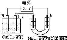 如下图,a、b是石墨电极,通电一段时间后,a极附近溶液显红色。下列说法不正确的是