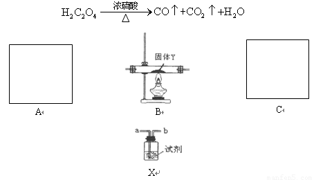 (16分)为了证明CO具有还原性,有人利用下列装置设计了系列的实验,其中A为气体发生装置,C为尾气处理装置,X装置可以盛放不同的试剂重复使用。已知草酸与浓硫酸共热发生如下反应: