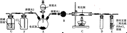 (3)点燃C处酒精灯,关闭弹簧夹2,打开弹簧夹1,从分液漏斗放出浓氨水至浸没烧瓶中固体后关闭分液漏斗,稍后片刻,装置C中黑色固体逐渐变红,装置E中溶液里出现大量气泡,同时产
