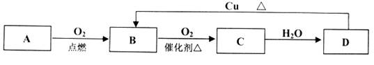 (8分)A、B、C、D四种物质之间有下图所示的转化关系。已知:A是一种非金属单质,为黄色晶体;B、C、D均为化合物;B是形成酸雨的主要成分之一。![]()