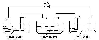 将分别盛有熔融的氯化钾、氯化镁、氧化铝的三个电解槽串联,如图,在一定条件下通电一段时间后,析出钾、镁、铝的物质的量之比为
