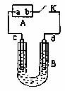 如图,A为直流电源,B为电解槽,c、d为石墨电极,B中存放有100mL NaCl和CuCl2的混合溶液,其中Cu2+的物质的量浓度为0.1mol/L,闭合K,d极收集到标准状况下448mL一种气体甲,该气体能使湿润的碘化钾淀粉试纸变蓝。气体体积均在标准状况下测定,假设溶液的体积变化忽略不计,不考虑电解产生的气体溶解和吸收。请回答下列问题。