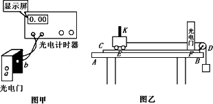 光电计时器是一种研究物体运动情况的常见计时器,其结构如图题甲所示,a、b分别是光电门的激光发射和接受装置.当有物体从a、b之间通过时,光电计时器就可以显示物体的挡光时间.现利用图题乙所示的装置设计一个“探究恒力做功与动能改变关系”的实验,图中AB是水平桌面,CD是一端带有定滑轮的等厚长木板.将光电门固定在靠近木板滑轮一端的F点(与之连接的光电计时器没有画出).小车上固定着用于挡光的窄片K,让小车从木板上的E点由静止释放,由光电门连接的计时器显示窄片K的挡光时间.