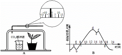 (1)将该装置放在自然环境下,测定夏季一昼夜小室内植物氧气释放速率的变化,得到如图B所示曲线,那么影响小室内植物光合作用速率变化的主要环境因素是 ;装置刻度管中液滴移到最右点是在一天中的 点。