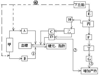 Ⅱ.右图为下丘脑对人体部分生理活动调节的示意图,图中英文字母表示激素,甲、乙、丙、丁表示内分泌腺,数字表示部分生理活动,其中,激素C的分泌受H的调控影响。虚线部分表示神经调控。