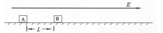如图所示,足够长的绝缘光滑水平面上分别固定着大小、形状完全相同的两个物体A、B,相距L=0.2 m,它们的质量mA=mB=0.2kg,其中A物体带正电,电量q=2×10-8c,B物体不带电。水平面上方存在水平向右的匀强电场,场强E=2.5×107N/C,在t=0时刻同时撤去固定两物体的外力后,A物体将沿水平面向右运动,并与B物体发生连续碰撞(碰撞时间极短),两物体碰撞时A物体电量不发生变化,并且每次碰撞时两物体速度均发生相互交换(g取10m/s2)。求: