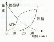 用5%的葡萄糖溶液培养酵母菌,先在有氧条件,然后转到无氧条件。有关物质浓度变化如右图所示,15rain时,ATP的相关变化是 ( )