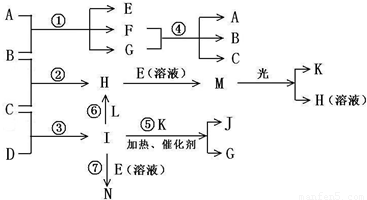 (3)反应④中,G(溶液)与K能以物质的量之比为1∶2反应生成L、H、I.L是一种火箭燃料,其分子中各原子均已达稳定结构.则L的电子式为________,该反应的化学方程式为________________.