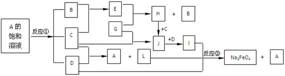 (10分)下图中的反应①是重要的电化学工业反应,反应②可用于制备新型消毒净水剂Na2FeO4。常温下B、C为气态单质,G是当代社会使用量最大的金属,其余均为化合物。(反应时加入或生成的水,以及生成沉淀I时的其他产物均已略去) 。![]()