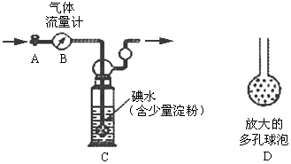 甲方案:如下图所示,图中气体流量计B用于准确测量通过尾气的体积.将尾气通入一定体积已知浓度的碘水中测定二氧化硫的含量.当洗气瓶C中溶液蓝色消失时,立即关闭活塞A.