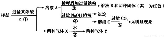 摘要:20.由Fe2O3.CuO.A1.C中的几种物质组成的混合粉末.取样品进行下列实验: (1)混合气体Y中两种气体的化学式是 .反应①中生成混合气体X的化学方程式是 . (2)通过上述实验及其现象说明.一定不含有的物质是 .不能确定是否含有的物质是 , (3)为进一步确定样品中的未知物质.可以用上述反应过程中的溶液.设计一个简单的后续实验就可以确定.方法是: .