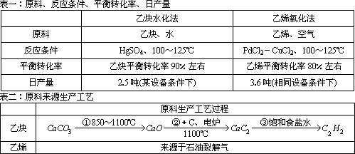 (3)工业上目前使用两种方法制取乙醛——“乙炔水化法”和“乙烯氧化法”.下面两表提供生产过程中原料、反应条件、原料平衡转化率和产量等的有关信息: